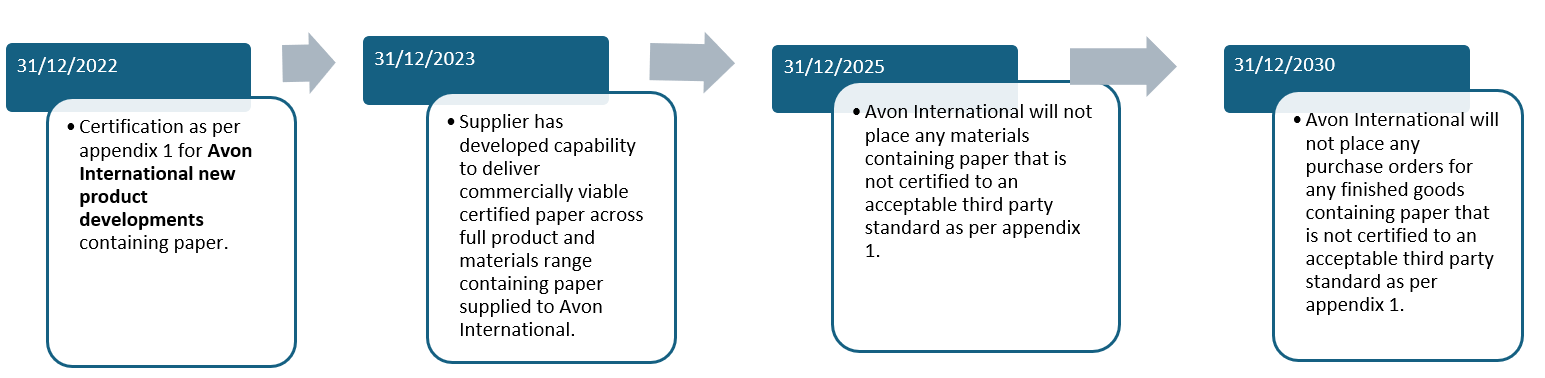 - Traceability and certification requirements in brief: All paper supplied to Avon must be 100% recycled or certified to an acceptable third-party standard by the end of 2025 for materials and by end of 2030 for finished goods. Although acceptable third-party standards for paper give sufficient level of traceability, additional traceability information could be required. More details are given in section 2 of this policy.