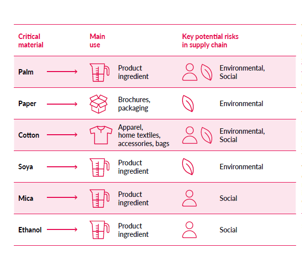 Our Critical Materials policiescover six materials we source that are associated with relatively high potential human rights and/or environmental risks (cotton, mica , palm , soy , paper and ethanol ). To address this, these policies set clear standards on traceability of these supply chains to the country of origin, and require certification that production meets specific international standards – including the prohibition of forced labour.