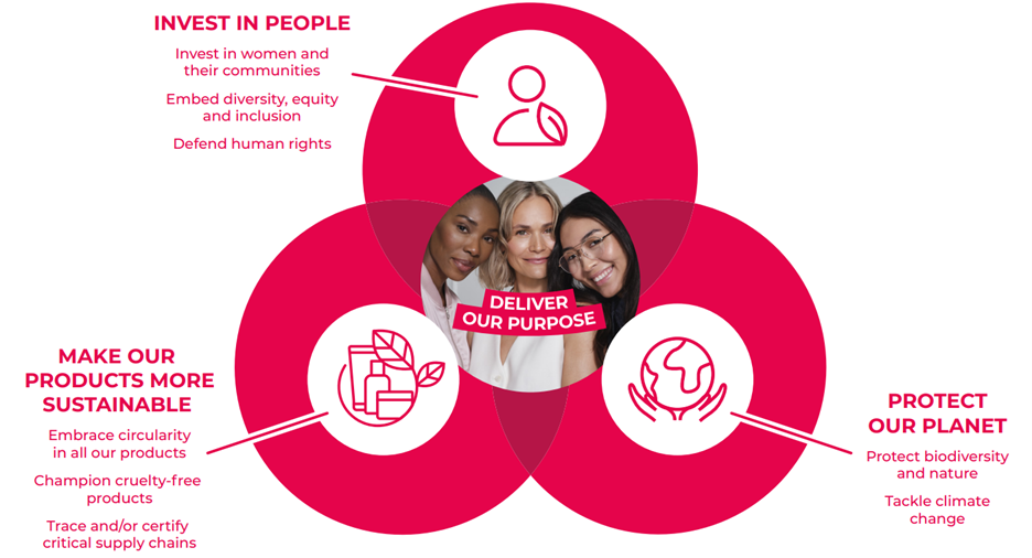 Avon’s work is guided by our Sustainable Growth Strategy and key performance indicators (KPIs) specifically relating to protecting our planet, investing in people and making our products more sustainable (see diagram).